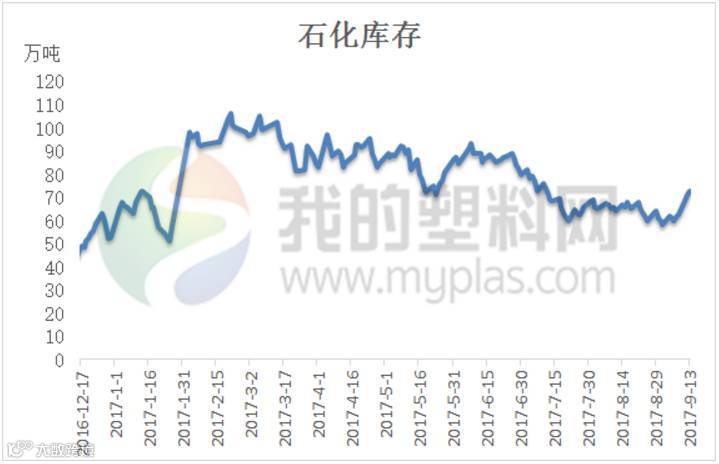 三季度以来7-8月份检修较多,石化整体供应缺口较大,8月份装置检修逐渐减少,损失产量较7月大幅回落,9月份又再度呈逐渐递减的趋势,国内炼化企业检修装置逐渐开工,停车检修环比减少。停车检修涉及产能由7月份的422万吨,8月份的305万吨,降至目前的93万吨。当前涉及到的企业仅有神华新疆27万吨高压装置;中天合创25万吨高压装置;上海石化1PE一线和1PE二线各5万吨。石化库存方面也跟随装置检修的减少而逐渐增高。