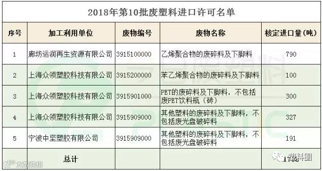 2018年第10批废塑料进口许可名单及相关数据已经出炉。这一批次公示的加工利用单位只有3家,核定进口量1708吨。具体情况如下图所示: