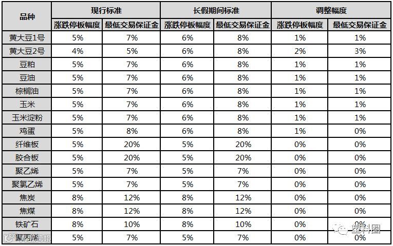 自2018年4月26日(星期四)结算时起,黄大豆1号、黄大豆2号、豆粕、豆油、棕榈油、玉米、玉米淀粉品种涨跌停板幅度和最低交易保证金标准分别调整至6%和8%;鸡蛋品种涨跌停板幅度调整至6%,最低交易保证金标准维持8%不变;焦炭、焦煤、铁矿石、聚乙烯、聚氯乙烯、聚丙烯、胶合板和纤维板品种涨跌停板幅度和最低交易保证金标准维持不变。