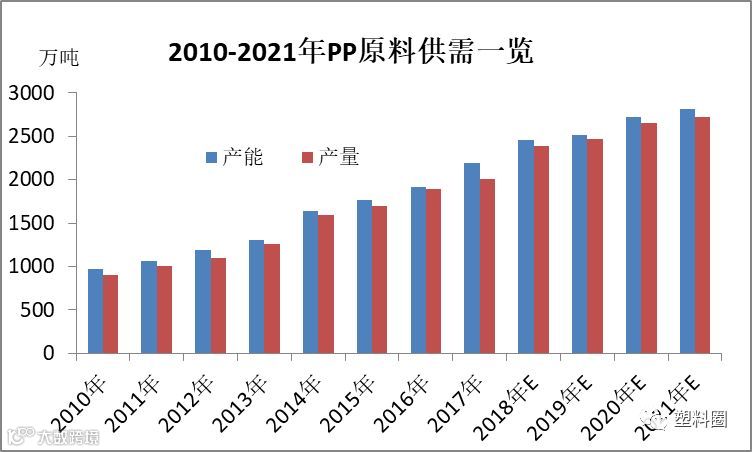 据我的塑料网统计,2017年,国内PP原料新增产能126万吨/年,同比去年的240万吨/年减少47.5%。2018年之后,国内PP原料新增产能依然较多,尤其是2019年预计新增产能在415万吨/年;但由于新装置推迟是大概率事件,并且前期运行不稳定,因此PP原料产量释放存在较大的不确定性,PP市场供需将面临再平衡过程。