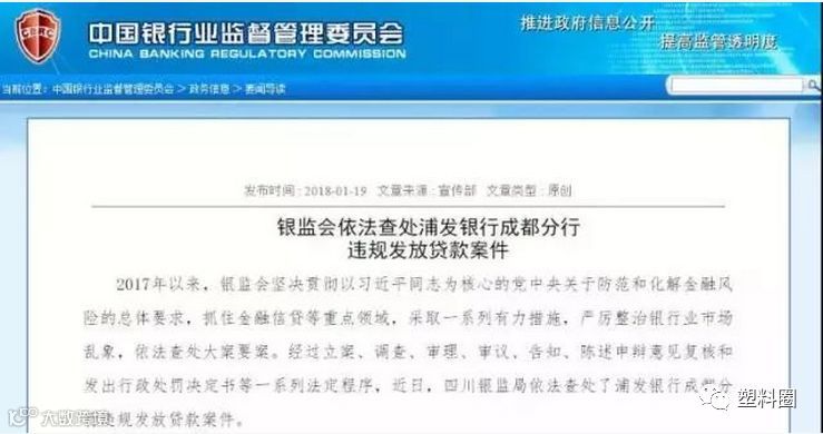 1月19日,银监会公布依法查处浦发银行成都分行违规发放贷款案件。四川银监局公布对浦发银行成都分行案做出处罚,共罚没4.62亿元,相关责任人也被处理。