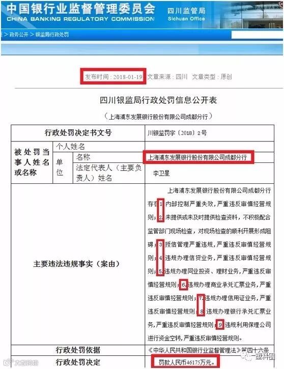 在四川银监局公布的行政罚单中,四川银监局依法对浦发银行成都分行罚款4.62亿元;对浦发银行成都分行原行长、2名副行长、1名部门负责人和1名支行行长分别给予禁止终身从事银行业工作、取消高级管理人员任职资格、警告及罚款。