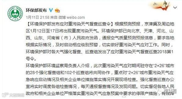受不利气象条件影响,1月12日至17日,京津冀及周边地区将出现一次区域性重污染天气过程。为此,1月11日,保部发布应对重污染天气督查巡查令。