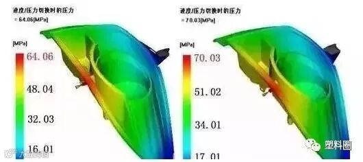 通过模流分析软件,分析出速度/压力切换时的压力分布情况,压力越高的,参与的应力也就越大。
