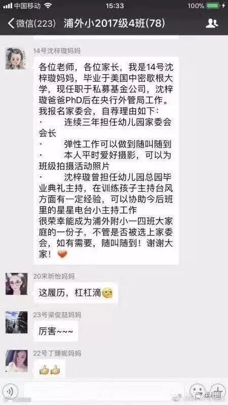 毕业于美国密歇根大学的高材生妈妈驾到,瞬间都是杠杠滴掌声。这还不够,顺带把出类拔萃的孩子他爸也写在自我介绍里,拉来孩子他爸助阵。真是厉害了……
