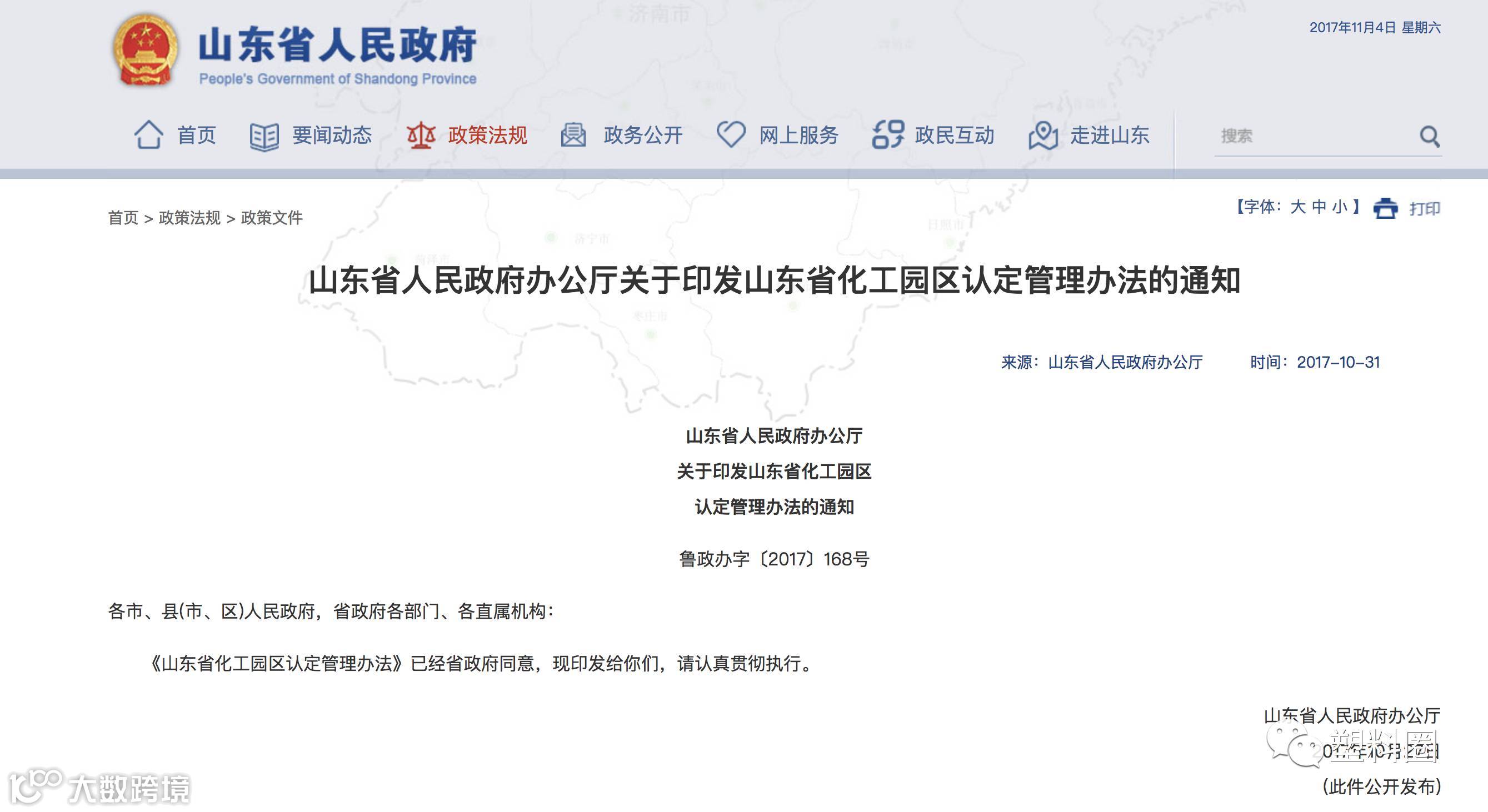 近日,山东省政府办公厅印发了《化工园区认定管理办法》,该办法自印发之日起施行,按照该办法,化工园区认定应同时满足12项条件,包括“远离所在城市主城区,不处于主城区主导风向上风向”、“危险废物安全处置率达100%”、“设有集中的安全、环保监测监控系统”等。