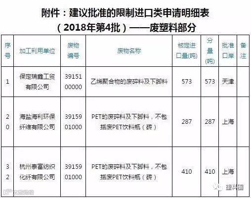 2018年1月22日,环保部固废中心公示了第四批建议批准的限制进口类申请明细表,主要以废纸类为主。本次公示共3家废塑料进口企业,其中1家为乙烯聚合物的废碎料及下脚料类,另外2家为PET的废碎料及下脚料,不包括废PET饮料瓶(砖)类,总计1270吨。具体公示表如下: