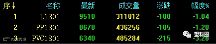 今日塑料相关品种弱势下跌。日内能化板块走势偏弱,PVC主力V1801位列能化跌幅榜首,收盘跌3.28%。聚烯烃产品破前一交易日低点,L1801跌幅1.04%,PP1801跌幅1.20%。