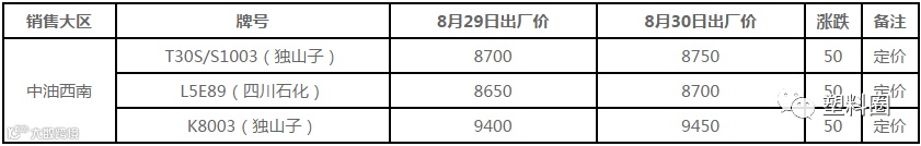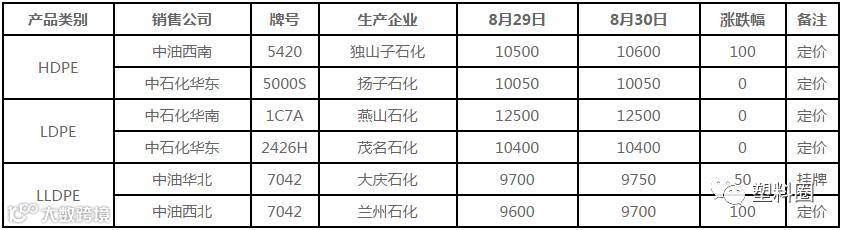 8月30日国内PE出厂价格调整(单位:元/吨)