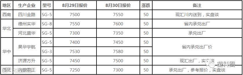 8月30日国内PVC出厂价格调整(单位:元/吨)