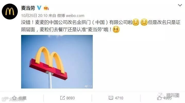 改名这件事情静悄悄的,但是现在“闹大了”,麦当劳的官方微博也出来承认了。这是不是意味着以后去麦当劳要改成去“金拱门”了?对此官微也进行了解释,改名的只是证件层面,不用担心“麦当劳”这个如此具有识别度的标志从此消失。