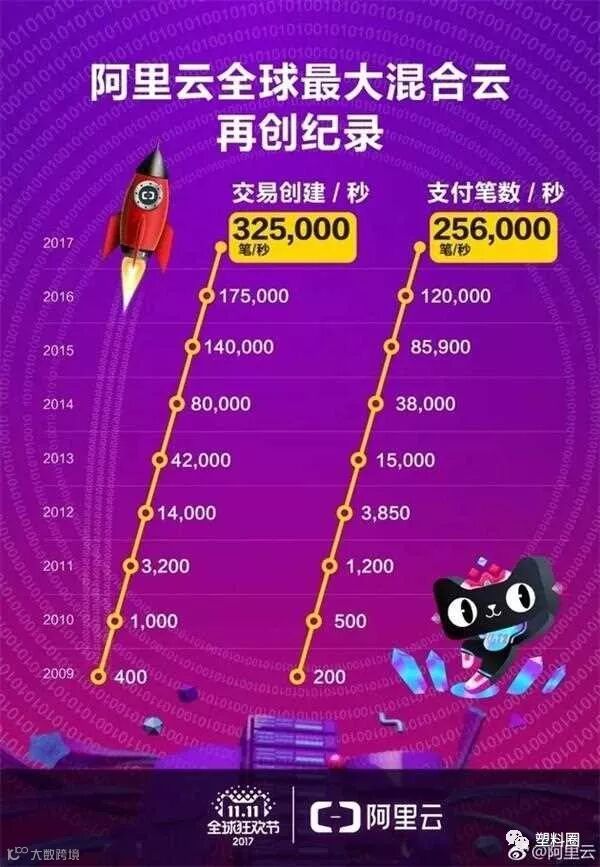 根据阿里云统计,2017年“双十一”支付峰值时期,每秒钟就有25.6万笔交易成交,在2009年,这一速度仅有200笔/秒,支付速度提高了1280倍。