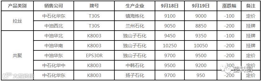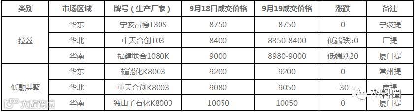 拉丝主流价格在8700-9000元/吨不等;低融共聚主流价格在8750-10050元/吨不等。