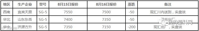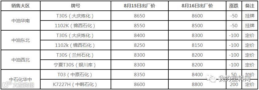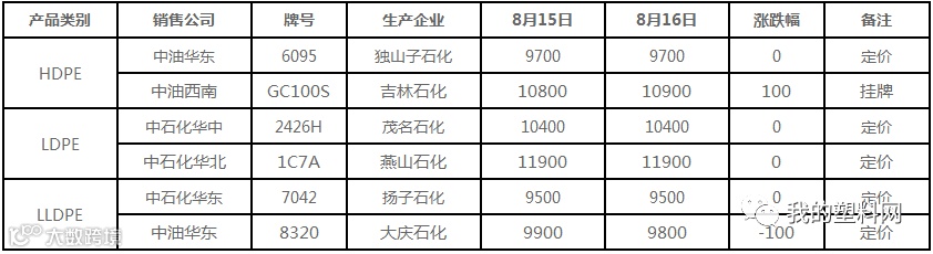 8月16日国内PE出厂价格调整(单位:元/吨)