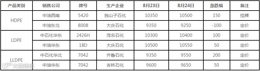 8月24日国内PE出厂价格调整(单位:元/吨)