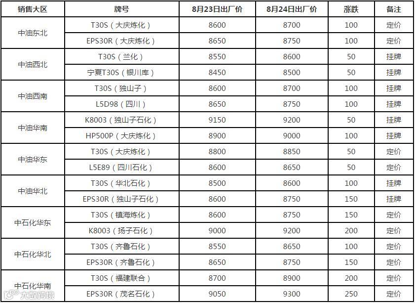 8月24日国内PP出厂价格调整(单位:元/吨)