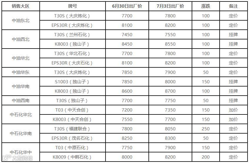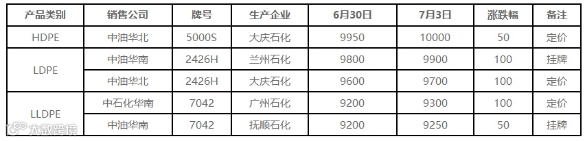 7月3日国内PE出厂价格调整(单位:元/吨)