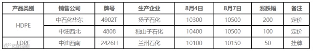 今日国内PE市场价格小幅涨跌。早间线性期货高开,华北和华南线性报价略高50元/吨,随后期货大幅下行,部分市场报线性价跌幅在50-100元/吨,华东部分拉丝价格走低50-100元/吨,中空货少价挺,报价走高100-200元/吨。周初谨慎观望居多,午后线性报价继续松动,华北报价走跌30-50元/吨,终端询盘一般,成交尚可。LLDPE主流市场价格在9300-9800元/吨,LDPE主流市场价格在9850-10350元/吨,HDPE膜主流市场价格在9300-9850元/吨。