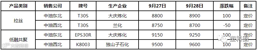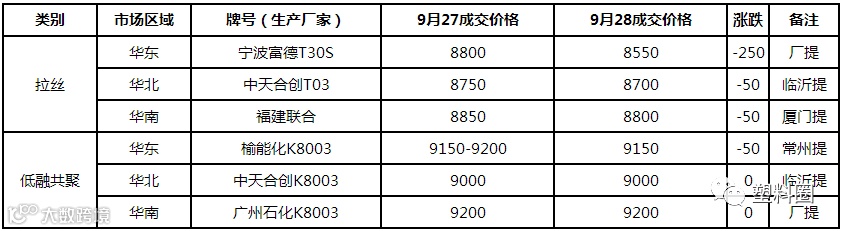 拉丝主流价格在8500-8900元/吨不等,低融共聚主流价格在9000-9980元/吨不等。