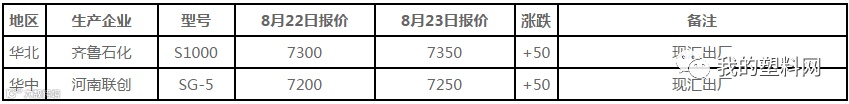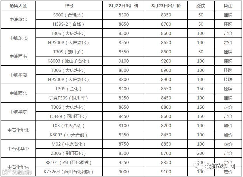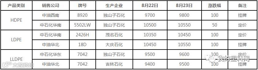 8月23日国内PE出厂价格调整(单位:元/吨)