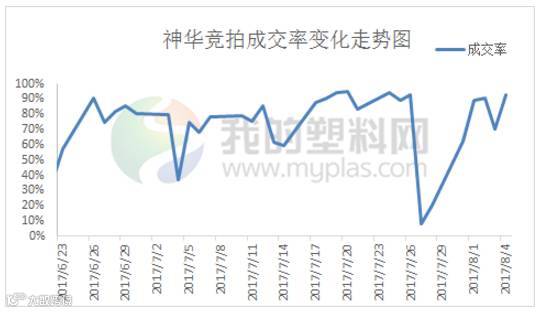 本周国内神华系列PP竞拍平均成交率在81.04%,较上周61.11%提升19.93%。其中成交率峰值出现在8月4日,成交率上升至92.79%,主因石化出厂价格稳定及期货低开拉涨,一定程度提振业者信心。部分商家试探出货,以低价货源成交为主。谷值出现在7月31日,成交率在下降至62.34%,主因期货盘中回落,打击市场看涨心态。部分商家小幅让利,寻求成交。