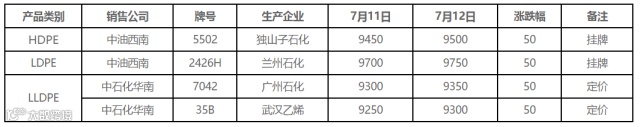 7月12日国内PE出厂价格调整(单位:元/吨)