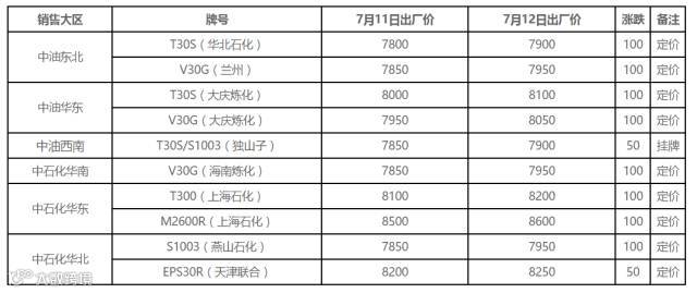 7月12日国内PP出厂价格调整(单位:元/吨)