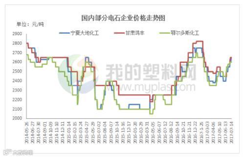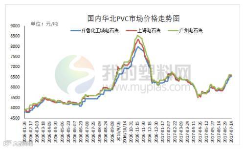 本周国内PVC市场价格整体上涨,涨幅在200元/吨上下。周初,现货市场延续上周涨势,场内炒涨氛围浓厚,商家报价继续上涨。周三开始,V1709期货出现大幅下跌,现货市场热情逐渐冷却,场内转涨为稳,观望氛围凸显。临近周末,期货部分多头平仓,空头加压,现现货市场商家出货积极性提高,部分实盘让利,但在PVC企业挺价支撑下,市场跌幅有限。截止到本周末国内电石法5型料主流报价在6460-6630元/吨;乙烯料主流市场价格在6800-6950元/吨,高型号价格高100-150元/吨。
