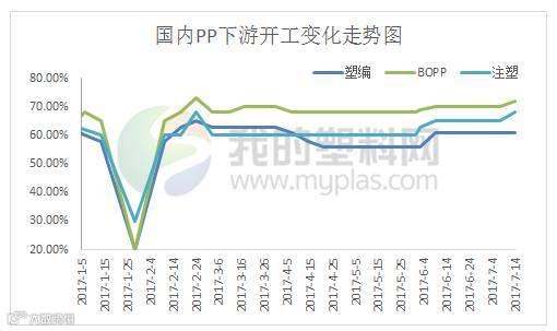 截止7月14日当周,国内聚丙烯下游行业开工率较上周略有抬升。其中塑编行业开工率在61%左右,共聚行业开工率在68%,BOPP行业开工率在71%左右。