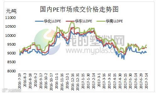 我的塑料网(www.myplas.com)预计下周国内PE市场窄幅整理,部分牌号仍有上涨空间,幅度在100-200元/吨左右。LLDPE价格在8900-9500元/吨,LDPE主流市场价格在9550-10200元/吨,HDPE膜料主流市场价格在9100-9700元/吨。