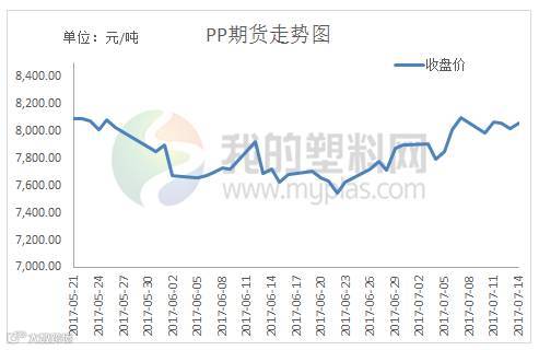 本周国内PP期货主力1709合约震荡走软。具体来看,周初开盘价在8100元/吨,周五收盘8064元/吨,最高8188元/吨,最低7951元/吨,周跌33元/吨或0.41%。成交量减少至33.67万手,持仓量减少至67.09万手。