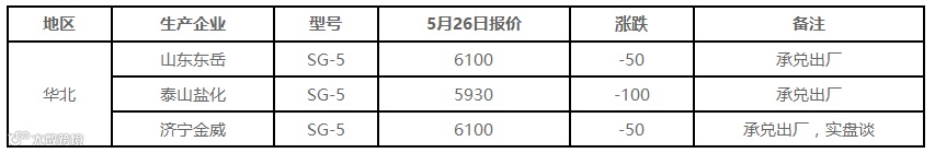 表6 5月26日国内PVC出厂价格调整(单位:元/吨)
