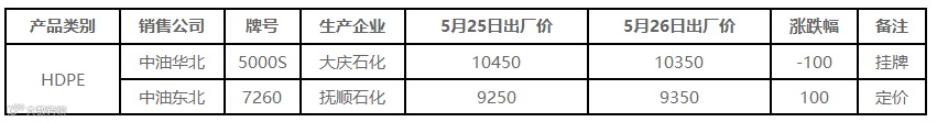 表4 5月26日国内PE出厂价格调整(单位:元/吨)