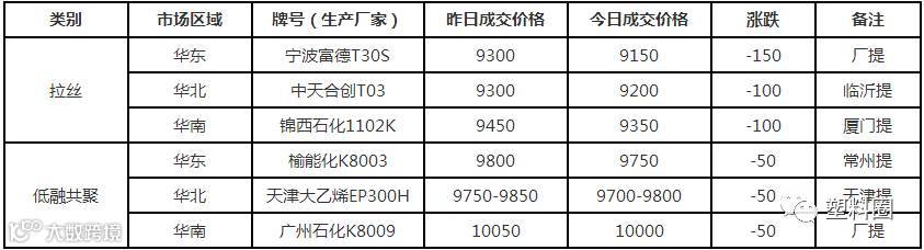 拉丝主流价格在9200-9550元/吨不等;低融共聚主流价格在9300-10400元/吨不等。