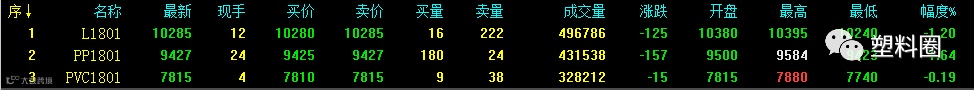 L1801、PP1801跌逾1%,PVC1801结算价7810元/吨,跌0.19%。