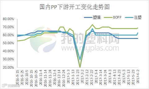 截止6月2日当周,国内聚丙烯下游行业开工率小幅回落。其中塑编行业开工率在56%左右,共聚行业开工率在63%,BOPP行业开工率在69%左右。终端整体需求并无亮点,同时制品库存消化缓慢、年中资金收拢、终端对于原料行情表现谨慎等诸多原因限制下游采购积极性,工厂多数维持随用随采的采购模式。