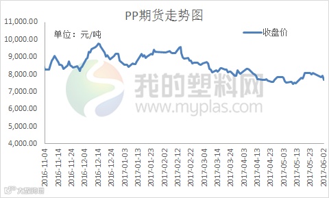 本周国内PP期货主力1709合约连续走低。具体来看,周初开盘价在8138元/吨,周五收盘8156元/吨,最高8156元/吨,最低7674元/吨,周跌352元/吨或4.39%。成交量增加至66.04万手,持仓量增加至68.84万手。