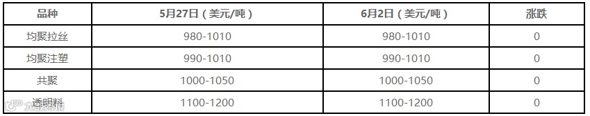 本周PE美金窄幅整理,拉丝价格小幅回暖,高压方面则成交重心继续下移。国内市场行情连涨结束,LL期货的走弱带动现货市场价格走低,部分下游工厂入市采购,低位成交有所放量。线性主流牌号报价仍在1090-1120美元/吨,华南保税货物价格在1130美元/吨。高压方面价格重心继续下移,市场主流报盘区间在1130-1200美元/吨,成交区间在1120-1160美元/吨。低压膜和中空方面,横盘整理,报盘暂稳。中空市场主流价格在1050-1070美元/吨。低压膜市场主流报盘在1080-1120美元/吨,部分泰国货物价格在1140美元/吨,成交尚可。低压注塑方面价格稳定,市场主流价格区间在1070-1110美元/吨。下周美洲远洋货物将陆续到港,部分贸易商仍在预售中,销售多人民币结算。外商方面,泰国某供应商6月船货低压膜1110美元/吨。即期,CIF中国主港,6月装船。