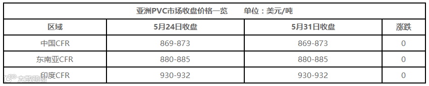 本周亚洲PVC市场气氛平静,6月份船货成交已经于上周交易结束,参考价格维持稳定。CFR中国维持在869-873美元/吨,CFR东南亚维持在880-885美元/吨,CFR印度维持在930-932美元/吨。参与者对于7月份市场走势存在较大分歧,部分市场人士认为6月份船货能够几天内销完,说明下游需求较为稳定,7月份船货价格仍有上调趋势,但另外一些市场人士认为7月份印度及东南亚市场将进入淡季,需求能否维持稳定人存在较大的不确定性。