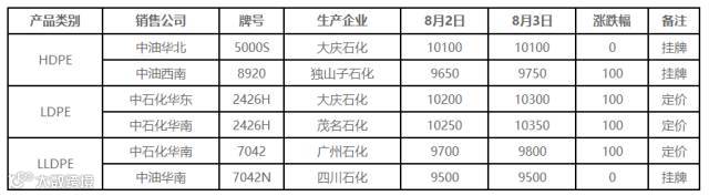 8月3日PE出厂价调整(单位:元/吨)