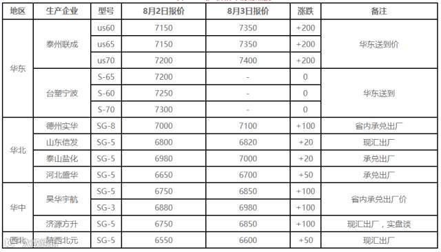 8月3日PVC出厂价调整(单位:元/吨)