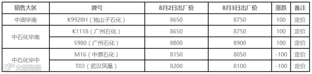 8月3日PP出厂价调整(单位:元/吨)