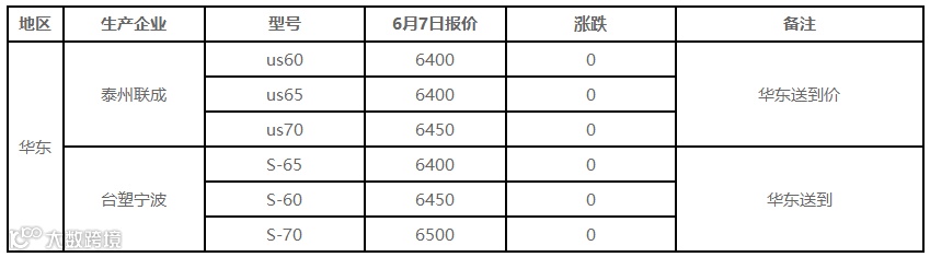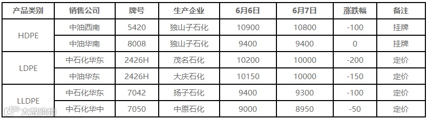 表4 6月7日国内PE出厂价格调整(单位:元/吨)