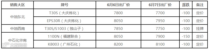 表5 6月7日国内PP出厂价格调整(单位:元/吨)