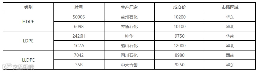 表1 6月7日我的塑料网PE市场成交价格(单位:元/吨)