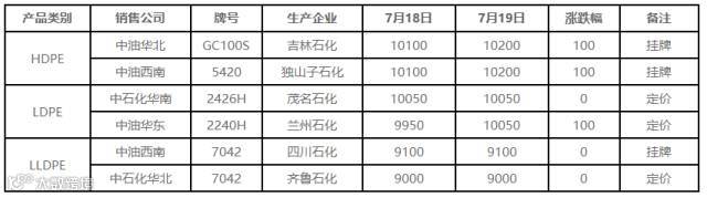 7月19日PE出厂价格调整(单位:元/吨)