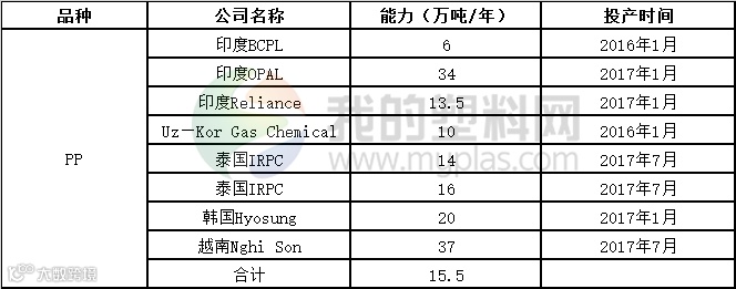 预计到2016年底,全球(不含中国大陆)聚丙烯产能5050万吨,2017年全球PP新增产能(不含中国大陆)144万吨,增长2.9%。预计到2016年底,包括中国大陆在内的全球聚丙烯产能7500万吨,2017年全球新增产能约415万吨,届时全球聚丙烯产能约为7915万吨,大部分聚丙烯新增产能产能来自中国,产能增幅5.5%。