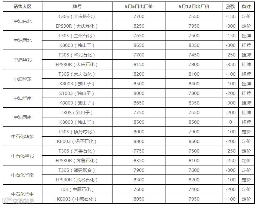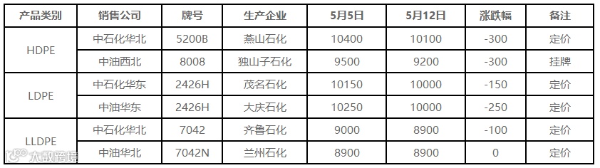 表1 本周国内PE出厂价格调整(单位:元/吨)