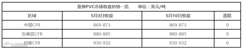 本周亚洲PVC价格维持稳定,CFR中国维持在869-873美元/吨,CFR东南亚维持在880-885美元/吨,CFR印度维持在930-932美元/吨。市场成交清淡,交易者观望为主,等待6月份船货报价出炉。目前参与者对6月份报价看法不一,看涨看跌均有。上游方面,乙烯价格有所回落。
