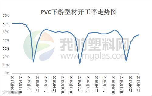 本周国内PVC下游制品开工率基本平稳,维持在48.2%上下。华北地区受一带一路会议影响,局部下游开工受限;华东、华南塑料制品企业维持按单生产状态,需求表现较为平稳。目前下游企业接货积极性不高,短期内维持按需小单采购。